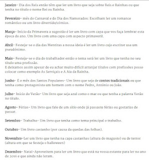 - Ler por mês um livro com um tema especifico para o Desafio Mensal - Acho engraçado andar à procura de livros que se enquadrem nas categorias e além disso faz-me ler livros da prateleira